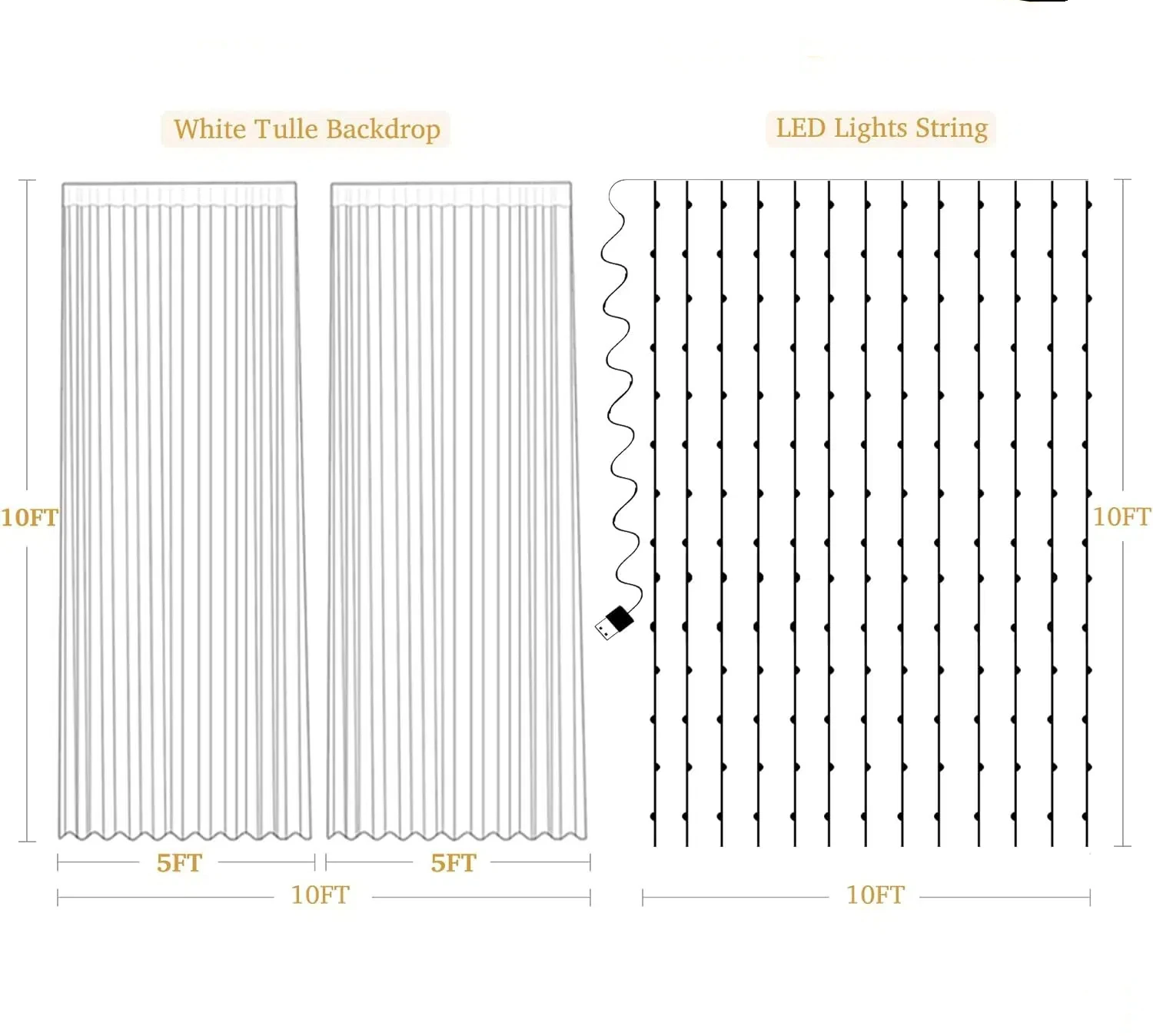 包装:包括 2 块 5 英尺宽、10 英尺高的薄纱背景窗帘、一套 9.8 英尺暖白灯串和 12 个透明夹子。