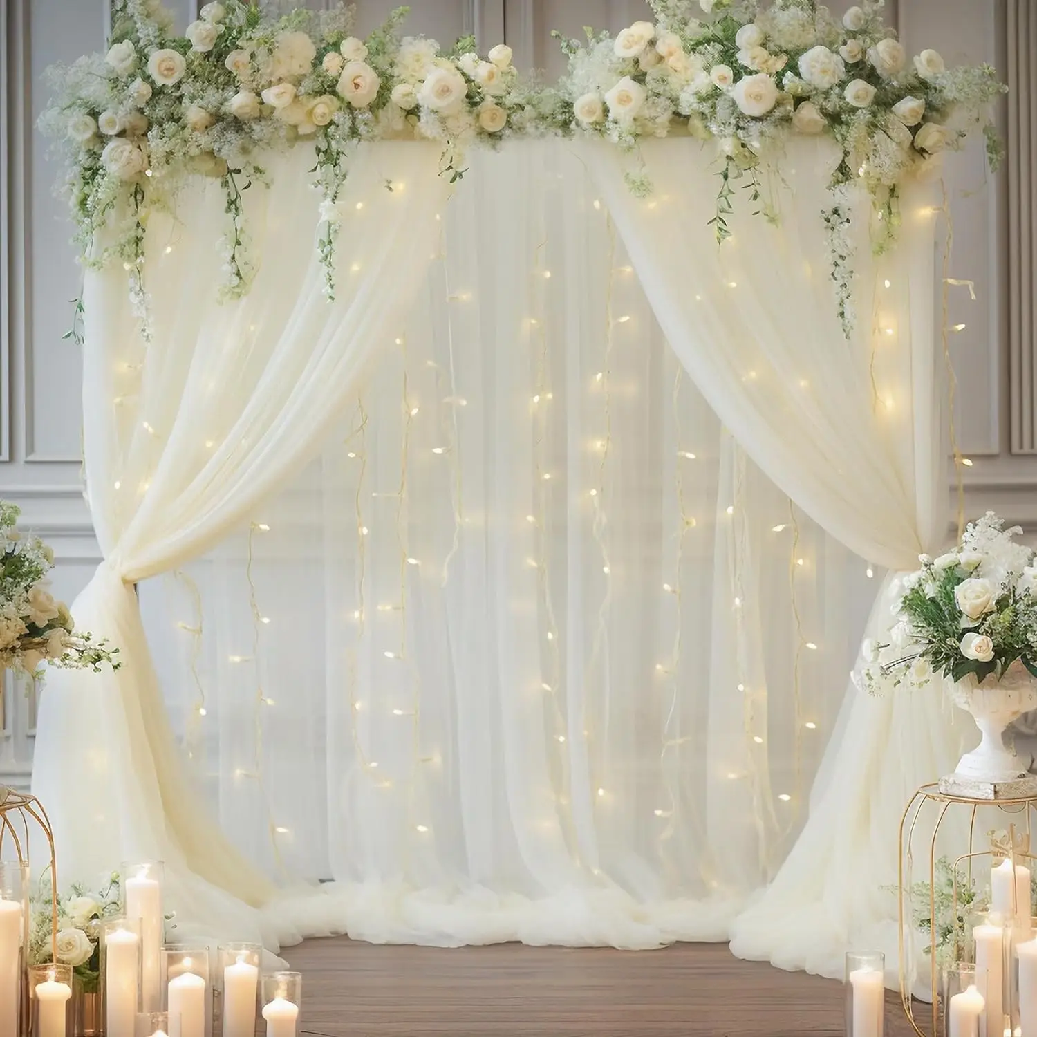 20ftx10ft Ivory Tulle Backdrop Curtain with Lights, 4 Panels 5x10ft Sheer Wrinkle Free Backdrop Drapes for Baby Shower Birthday